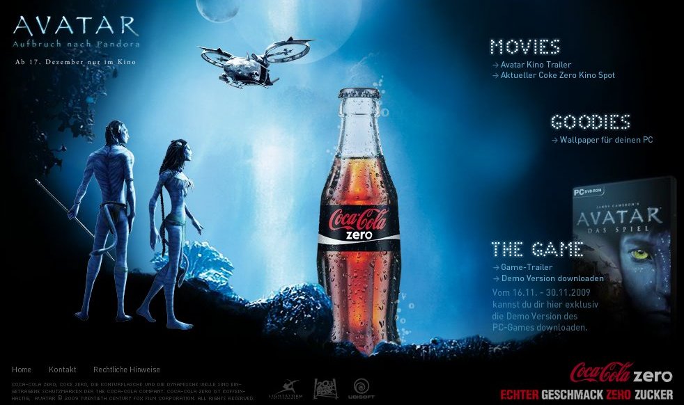 Nun ist auch Coke mit auf den Zug gesprungen und bringt unter dem Motto: „Erlebe Kino, wie es sein soll“ die AVTR Flasche auf den Markt.