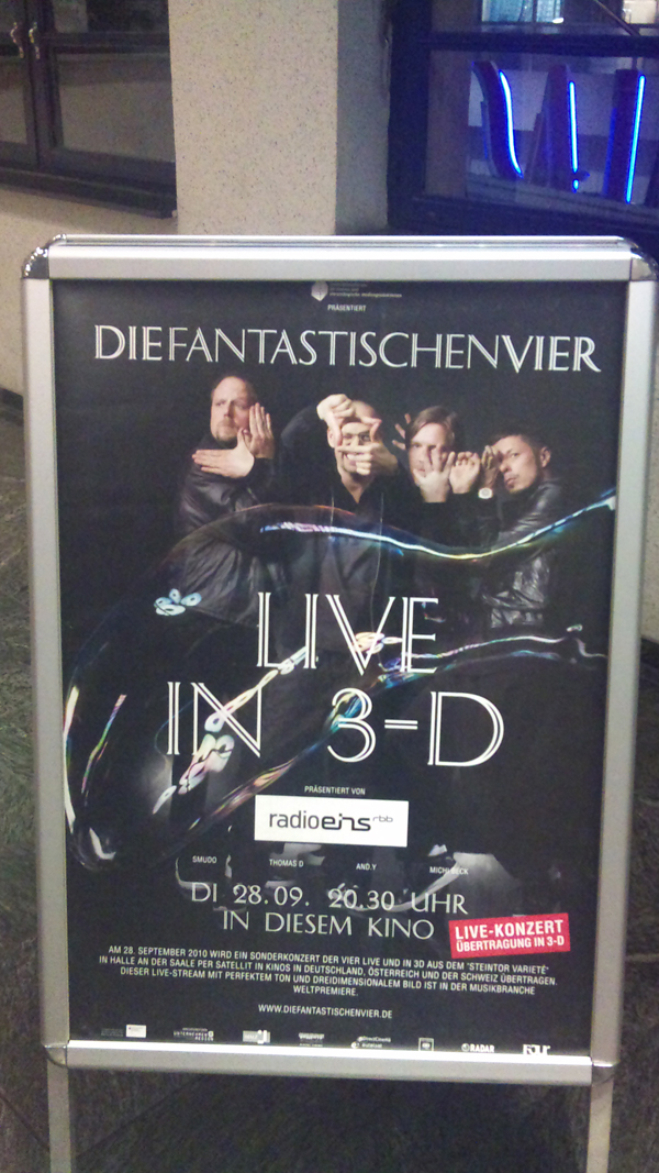 Ich war mit von der Partie, zwar nicht im Steintor Varieté in Halle aber dafür mit Brille im Cineplex Titania Kino in Berlin Steglitz. 17,50 Euro hat das Ticket gekostet aber das war es wert. Brillanter Ton und ein absolut professionell in Szene gesetztes Konzert mit tollen 3D-Bildern machten den Abend zu einem Erlebnis, das es in dieser Form noch nicht gegeben hat.