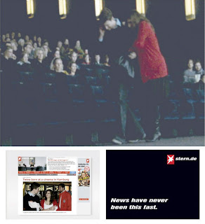 Zuletzt noch ein weiteres Beispiel für interessante Kinowerbung in Hamburg. In einem der Cinemaxx-Kinos in der Hansestadt startete Stern.de Mitte 2008 eine Aktion, um auf seine News-Website in Deutschland aufmerksam zu machen. Eine schwangere Frau stürzte während der Werbung, kurz vor dem Hauptfilm, aus dem Kinosaal. Die einsetzenden Wehen zwangen sie angeblich, das Kino gemeinsam mit ihrem Mann zu verlassen. Während die Besucher über das dramatische Geschehen diskutierten, klärte Stern.de wenige Sekunden später auf der Kinoleinwand auf: „Zwillinge in Hamburger Kino geboren.“ So schnell waren Nachrichten noch nie.