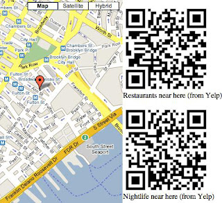 Ebenfalls aus den USA kommt eine  Entwicklung, die es ermöglicht, auf dem Stadtplan ein Gebiet zu markieren und sich dann für diese Gegend Restaurants, Clubs, Geschäfte oder Ärzte anzeigen zu lassen. Das funktioniert via Mash-up der beiden Webdienste Google Maps und yelp.com. Für den markierten Bereich wird ein QR-Code erstellt, mit dem der User unkompliziert die bei yelp.com hinterlegten Informationen abrufen kann. Gegenüber ähnlichen Diensten hat dieses System den Vorteil, dass die Inhalte dynamisch sind und die vielen Rezensionen der yelp-User helfen können, eine passende Location zu finden.