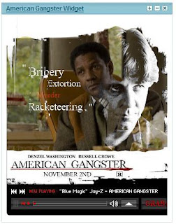 Auch zum neuesten Denzel Washington Film American Gangster setzt das Studio bei der Promotion auf den Einsatz von Widgets, die allerdings universell einsetzbar sind. So kann man neben einer Einbindung in Facebook, MySpace oder andere Profilseiten auch bei iGoogle sein Filmwidget einbauen.