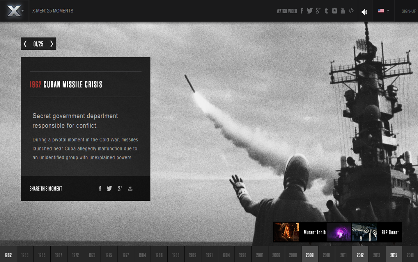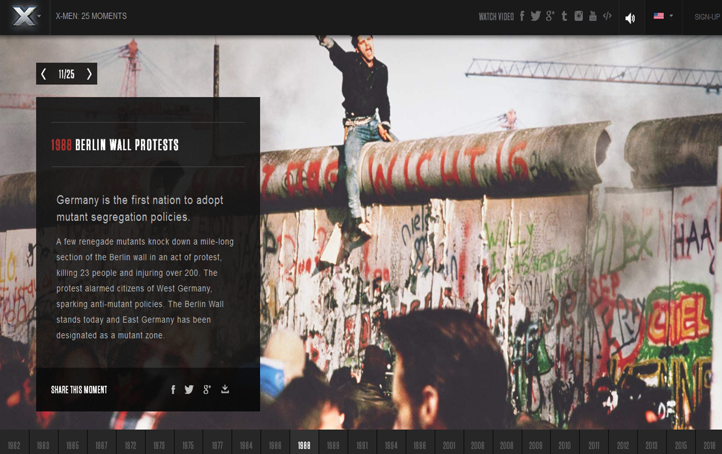 Startend mit der Kuba-Krise 1962 bei der Magneto die Lenkwaffen beeinflusste nennt die informativ gestaltete Seite auch einen Zwischenfall an der Berliner Mauer 1988, bei der Mutanten angeblich ein Teil der Mauer eingerissen haben sollen.